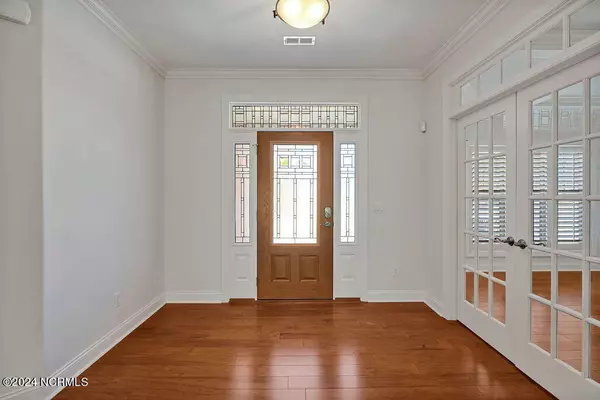 A 3-bedroom/3-bathroom brick home, the Mason II Model by Trusst Builder Group, located in the Hearthstone Community of Leland. With a covered front entry, office, screen porch, and a bright and open floor plan. You will find attention to detail throughout, including trey and coffered ceilings, plantation shutters throughout, wood shelving in the closets, and hardwood flooring in the main living areas. The living room includes a propane gas fireplace, built-in shelving & cabinets, coffered ceilings, crown molding, and a ceiling fan. The kitchen has cream cabinets, granite countertops, tile backsplash, recessed and pendant lighting, and a full pantry. Telescoping glass doors allow open access to the screen porch from both the living room and the dining room. The screen porch is complete with Exe-breeze windows, skylights and ceiling fan, maximizing the additional living space. The primary bedroom is enhanced with an illuminated trey ceiling, crown molding and two walk-in closets. Separate vanities with granite counters are found in the primary bath, along with a walk-in tiled shower with a frameless door and two shower heads. French doors lead you to the bright office/study. The first-floor guest bath has a tub/shower with ceramic tile surround, while the second-floor guest bath is complete with a ceramic tile shower with glass door. The laundry room includes a storage cabinet, and the washer and dryer convey. Access to the partially floored attic is accessed through second floor walk-in closet. A utility sink is conveniently located in the 2-car garage along with a storage closet and an access door leading to the side of the house. Sellers are offering a one-year 2-10 Buyer's Home warranty for peace of mind! The Hearthstone Community includes an outdoor pool and is located close to area shopping & restaurants. Historic downtown Wilmington is a 20-minute drive and you'll be on New Hanover or Brunswick Beaches in 30 minutes.